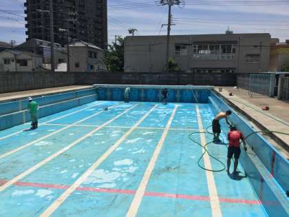 3年生の修学旅行中の、日6月14日(水)に体育科の先生方と管理作業員さんに、プール清掃をしていただきました。