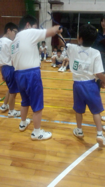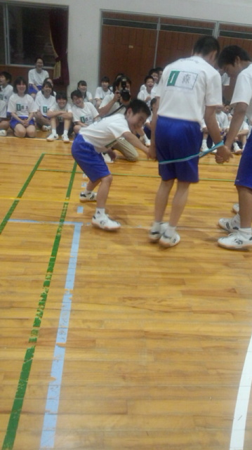 続いて、「たすきをつなげ」です。男女7人が、手をつないだまま、たすきを移動させていく競技です。早くたすきを移動させたクラスの勝ちです。