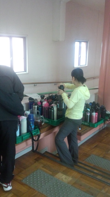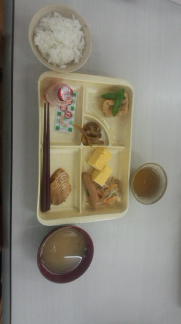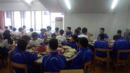 上の写真は、今朝の朝食です。真ん中は、食事のようすです。下の写真は、先生方が、手分けして、また、水筒にお茶を入れている様子です。