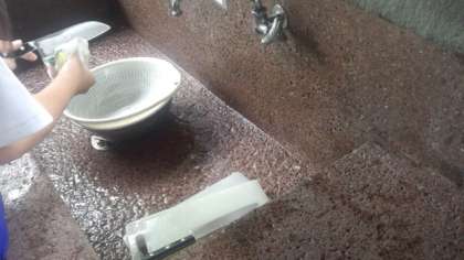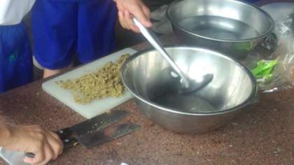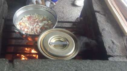 これは、何を刻んでいるのでしょうか?かまどの今の様子です。使い終わった調理道具は、どんどん洗います。