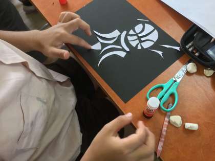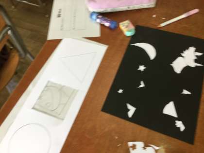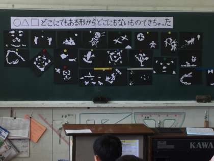 黒い画用紙に並べられた作品は、バスケットボールであったり、夜空であったり、波間のヨットであたりと、実に多彩です。黒板に掲示されている作品を見ていると、子供たちの夢や希望が見事に表現されていて、楽しくメルヘンチックなものでした。最後にそれぞれの作品の題名と作品に込めた思いが、本人より発表されました。