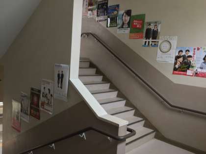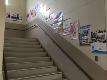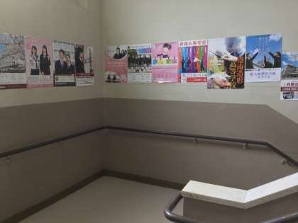 1号館の階段の壁面に、高等学校のポスターがたくさん掲載されています。