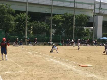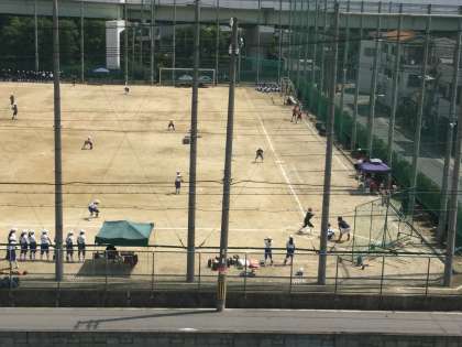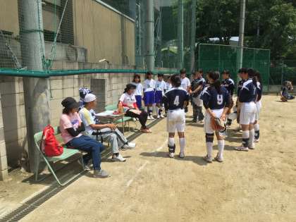 今日は朝から非常に気温が高く、強い日差しの中での試合でした。2面のコートで、各校とも複数回の対戦をしていました。顧問の先生から試合の状況に応じ、イニングの合間にベンチ前で指示や叱咤激励また説明等を受けていました。