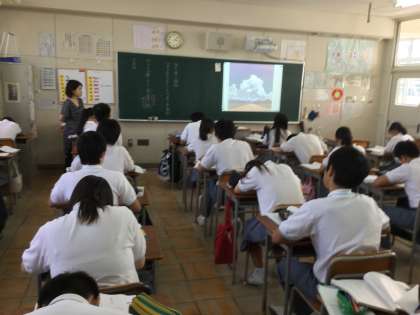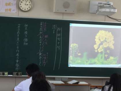 液晶プロジェクターから映し出された映像を見ながら、生徒達は五・七・五の十七音の俳句からイメージを膨らませていました。