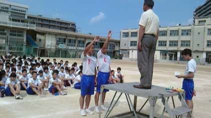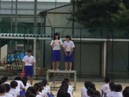 昨日の2年生水泳大会では朝から厳しい日差しのもとで行われましたが、本日は薄曇りでいくぶん助かりましたが、高温下の第1グラウンドに整列しての開会式となりました。