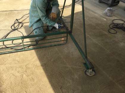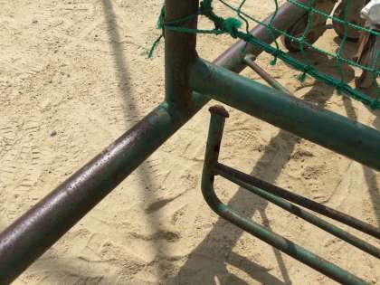 使用時間の多さや防球ネットの移動の多さ、グラウンドへのにがり散布の影響で、傷みが激しく溶接の剥がれや、パイプの腐食があり補修が待たれていました。