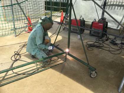 校園営繕園芸事務所(大阪市教育委員会内の施設維持補修組織)にお願いをして、補修していただくことになりました。7月3日〜7月20日の予定で作業をしていただいております。緑色の防球ネットを取り外して、破損個所の溶接を多数していただいています。溶接の火花が頼もしく見えます。