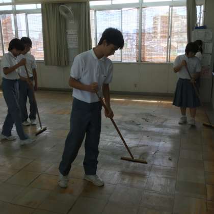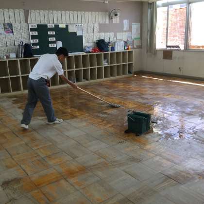 最初に掃き掃除と、モップでのふき掃除をして教室の1学期間の汚れを取り除きました。