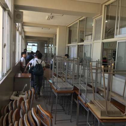 各学年とも昨日の大掃除できれいになった教室から、教習用机・椅子を廊下に出して、教室の中は空っぽです。
