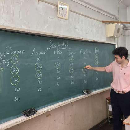 部活動では、有名なテレビのクイズ番組「Jeopardy」(ジェバディ)をしていただきました。6つのテーマごとに難易度により違う点数の質問をマイクが出し、部員が答えるものです。生徒は2チームに分かれて、正解したら設問の得点が回答者チームがもらえ、チームで争いました。