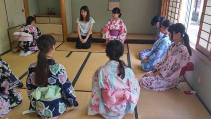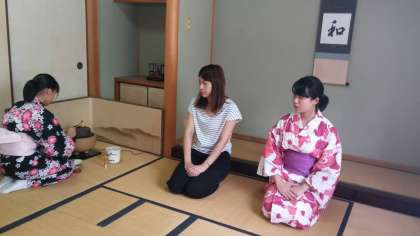 茶道部員が日頃学んだことの発表の場として、一生懸命頑張っていました。浴衣の華やかさと茶の静けさがあいまって、暑さを吹き飛ぶような、結構なお点前でした!!