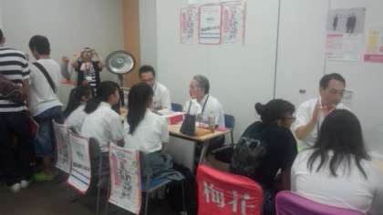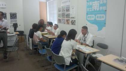 区役所の大会議室内に38の高校に別れて、相談や、説明が聞けるようになっていました。1つの高校で、二人以上の先生が来られている学校もあり、2家族が、それぞれ、相談をしてました。
