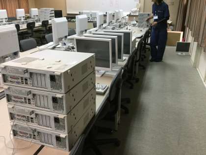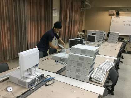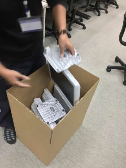 積み上げられたディスプレイ・ハブや配線等は、すぐに段ボール箱に詰め込まれ、梱包されて室外に運ばれていきます。みるみる積み上げられていきます。