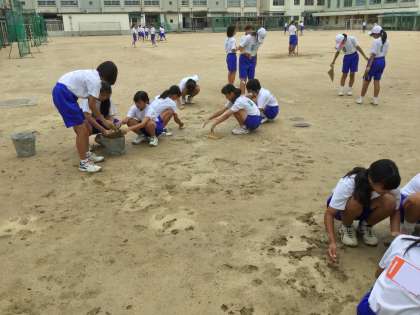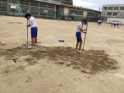 女子テニス部は、グラウンドの水たまりの水をスポンジで吸い取ったり・土を補給したり、レーキでならしたりと、整地に汗を流していました。