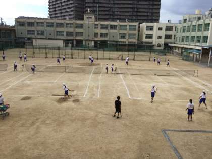 午前中の部活動のために登校してきた生徒達は、台風対策に伏せてあった防球ネットを起こしたり後始末をしました。