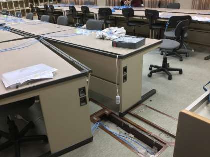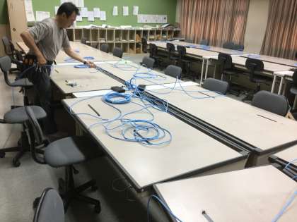 昨日パソコンが撤去されましたら、今日8月8日(火)には早くも、パソコン教室の配線工事がありました。