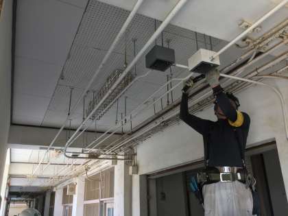 天井に直接付けることができる廊下もありましたが、ボード越しに取付となった場所もありました。ボード越しで直接目で見えないコンクリートにドリルで穴を開開ける作業は、相当の力を要し体を反っての力作業でした。