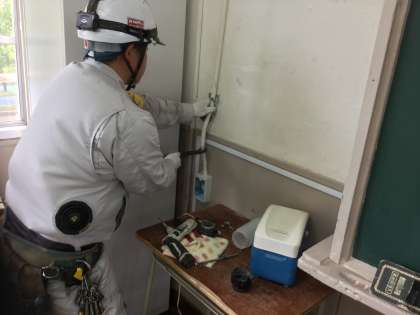 廊下天井の分岐から各教室にパイプが引き込まれ、黒板横の情報コンセント用に、パイプに微妙なカーブを加えて取り付けられていきました。