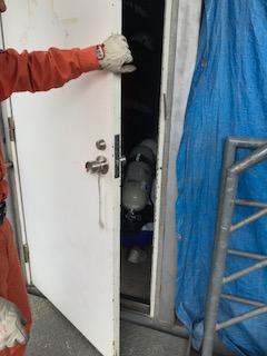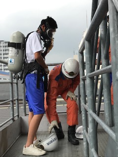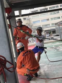 ロープをひっぱって下にいる人を引き上げる体験中です。