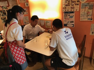 歌島中学校の二人の先生から、注文を聞いています。
