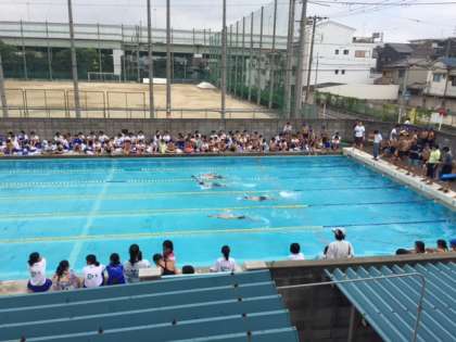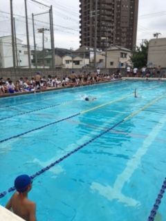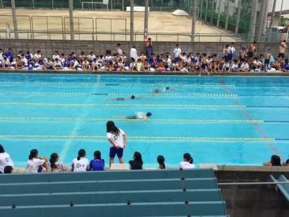 歌島中学校のプールは、昭和46年の完成以来46年間使用してきました。新校舎の建設に伴い今回解体される予定です。歌島中学校のプールにとって、1年生の水泳大会の泳ぎが最後の泳ぎとなりました。永年多くの生徒がお世話になりました。ありがとうございました。