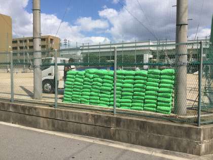 第1・第2グラウンドにそれぞれ100俵、合計200俵納品され、グラウンド脇に積み上げられています。