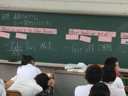今日の授業では、重要な3つの文章が先生から示され、生徒達は一生懸命覚えていました。またこの3つの文章は、単語を隠されたときにも答えられるようになっていきました。最後には、指名された生徒が暗唱して答えていました。