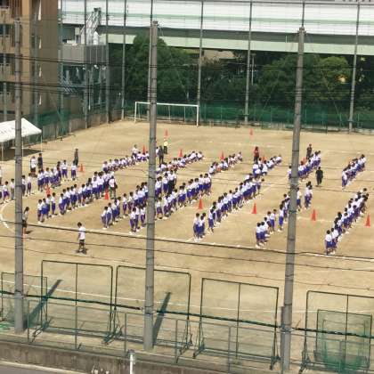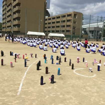 入場行進の後は、自分の席からの退場の練習をしました。退場のためグランド中央部に集合したときには、席には水筒が林立していました。