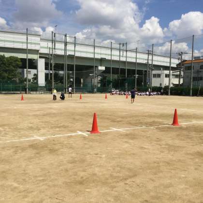 学年競技の練習では、グランドに並べられたコーンを利用して、先生方から競技の集合場所や競技内容の説明がありました。説明後には実際に並んで競技を確認していました。