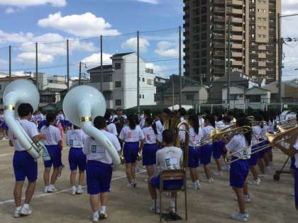 第2グランドでは、吹奏楽部員が大きな音を奏でてお出迎えです。
