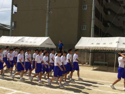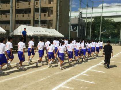 演奏に合わせて、1年生・3年生・2年生の各クラスが、プラカード・学級旗のポールを先頭にトラックを行進していきました。生徒達はどのクラスも指先までしっかり伸ばして腕を振り、ひざも高く背筋を伸ばしての行進でした。