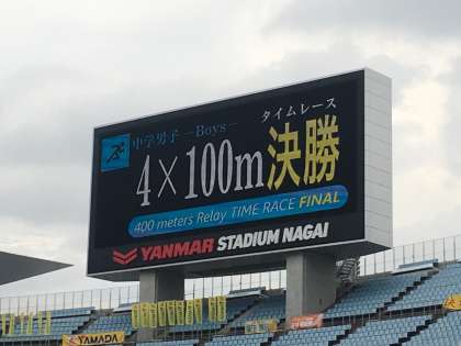 電光掲示板に出場チーム学校名や競技の様子が映し出され、いつもと違う臨場感がありました。歌島中学校チームのアンカーのフィニッシュが、ゴールライン上でタイミングよく写っていました。