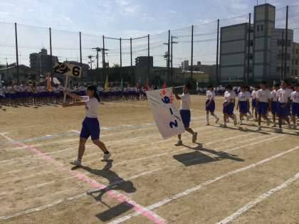 周回を終えて足踏みしている生徒が見ている中を、最後のクラスが入ってきました。