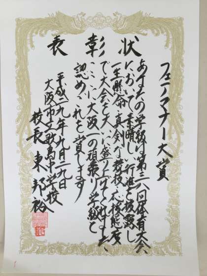 体育大会において、素晴らしい行進を披露し、一生懸命真剣な競技・応援態度で大会を大いに盛り上げた学級に選ばれたと、校長先生に認めていただいた賞です。