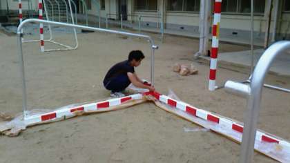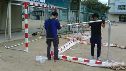 従来から使用していたハンドボールゴールが、錆びて腐食しており危険なため、更新の必要性がありました。このたび西淀川区役所の力添えで購入していただきました。従来の物は鉄製でしたが、今回納入されたものはアルミ製です。グラウンド隅での納入業者さんによる組み立て作業でした。