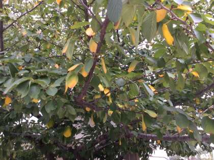 10月になって急に冷え込んできました。正門横の桜の木の枝の先の部分で、黄色く変色している葉っぱを見かけます。まだ一部の葉に限られますが、葉先から濃い黄色に変色し緑色との対比で鮮やかさが出ています。