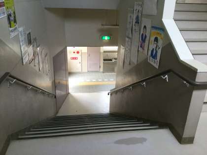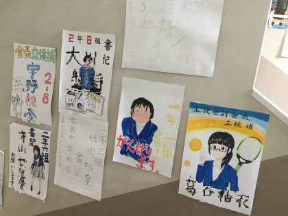 1号館の階段壁面、3年生の進路関係の掲示物に向き合うかたちで、立候補者のポスター貼ってあります。