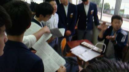 8時40分過ぎから練習が始まり、3年4組では教室内で男性と女性が別れて集まって練習していました。男性陣は担任の先生を囲んで教えを受けながらの練習でした。
