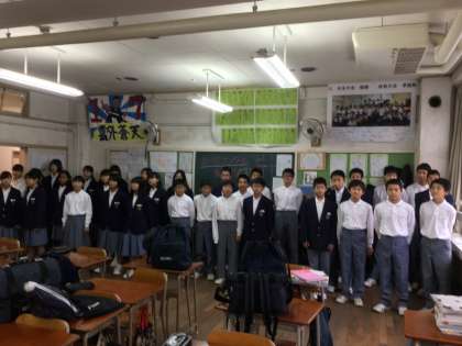 今日は3号館2階の1年7組の練習を見せていただきました。教習用机を黒板前に集めて後方に大きなスペースを作って、8時前でしたがクラスのほぼ全員が揃っての練習でした。黒板脇の机に置いたCDシステムから流れる伴奏に合わせての合唱です。