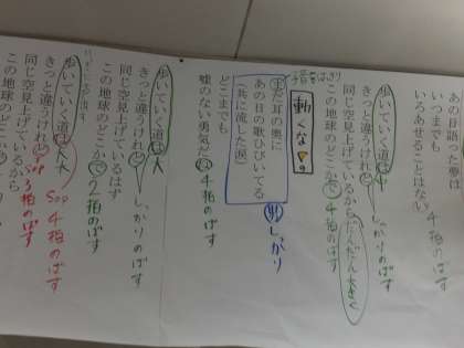 課題曲「ぼくらの世界」自由曲「この地球のどこかで」の歌詞が拡大して黒板の上に掲示されています。この紙面には「しっかりのばす」「子音をはっきり」「だんだん大きく」と、具体的で解りやすいポイント書き込まれていました。生徒達は指示に基づき大きな声で歌っていました。
