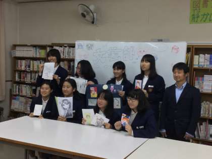 文芸部は図書館で本に囲まれて、手書きのイラストを掲げての撮影でした。