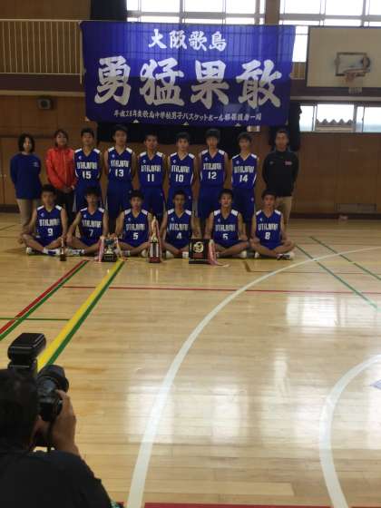 体育館の男子バスケットボール部は、慣れ親しんだ「勇猛果敢」の大きな幕と、トロフィー・楯を携えての写真でした。