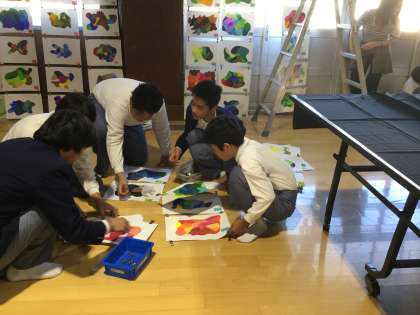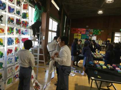 上の写真は展示作品の配色のバランスを考えて並べ替えをしているところです。真ん中の写真は、壁面に展示できるよう、作品につなぎ用の金具を付けています。高所は先生の協力を得て、吊り下げられました。