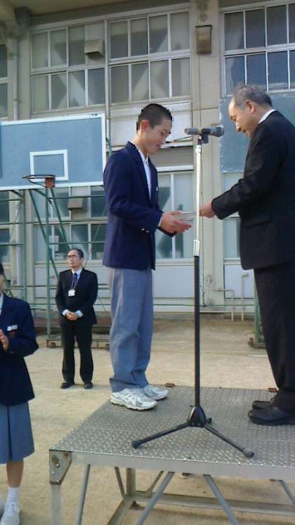10月16日(金)の後期生徒会役員選挙の結果、立候補者全員信任されました。全校集会にて新役員を代表して生徒会長に、副校長先生より認証状が授与されました。