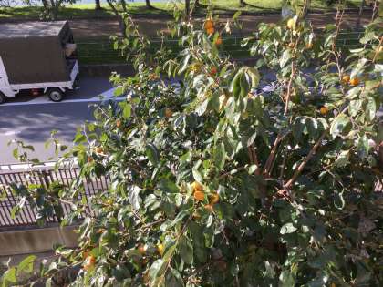 あれから3週間、文化発表会に注力している間に、ずいぶん濃い色に変色し、遠目にもカキの実が浮かび上がっています。