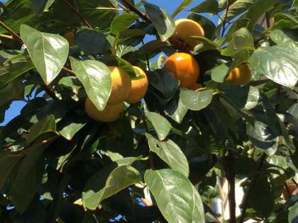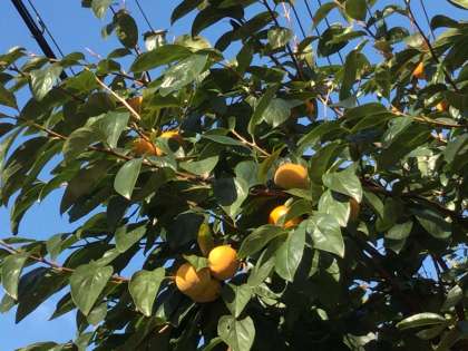 1昨日の台風の風雨、昨日の木枯らし1号に対して、今日は抜けるような秋空で、空の青さと柿の実の黄色のコントラストが際立っています。実のつややかな表皮が、太陽を反射していました。あまりたくさん実をつけているので、枝がしなり「みのりの秋」到来を感じました。