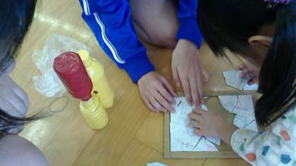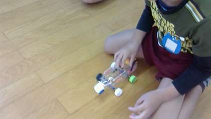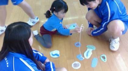 ペットボトルを利用して作った車は、スピードが出て軽やかに走り、園児にはお気に入りの品でした。ジグソーパズルにも中学生にヒントをもらいながら挑戦しました。色鮮やかな魚釣りもあり、上手に釣りあげていました。