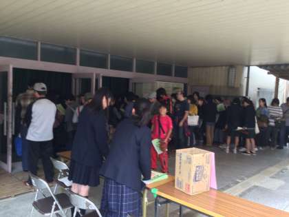 13時30分の開場前には、体育館周りは長蛇の列となっていました。吹奏楽部の卒業生が、受付をしてくれていました。