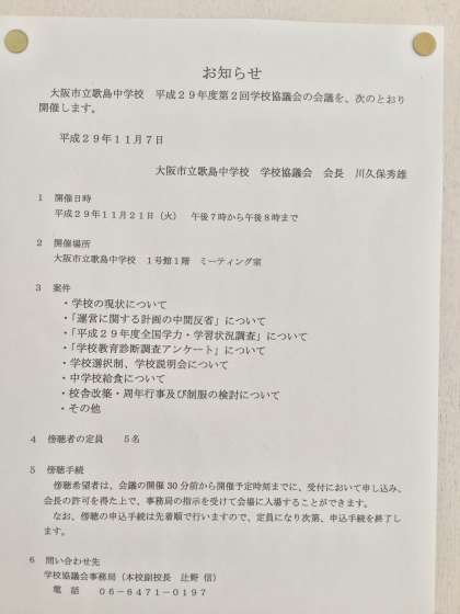 大阪市立歌島中学校 平成29年度第2回学校協議会の会議を、次のとおり開催します。