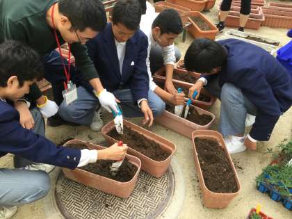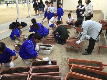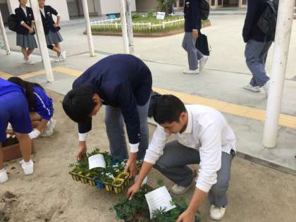 本日の作業の準備中に、下校途中の3年生が協力を申し出て、固くなっていた土をコテでほぐしてやわらかい土にしてくれました。また容器に入っていた花苗の運搬も手伝っていただき大助かりです。ありがとうございました。